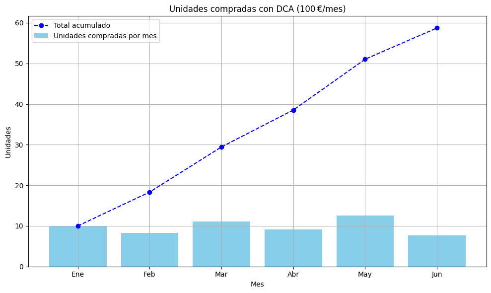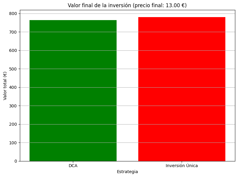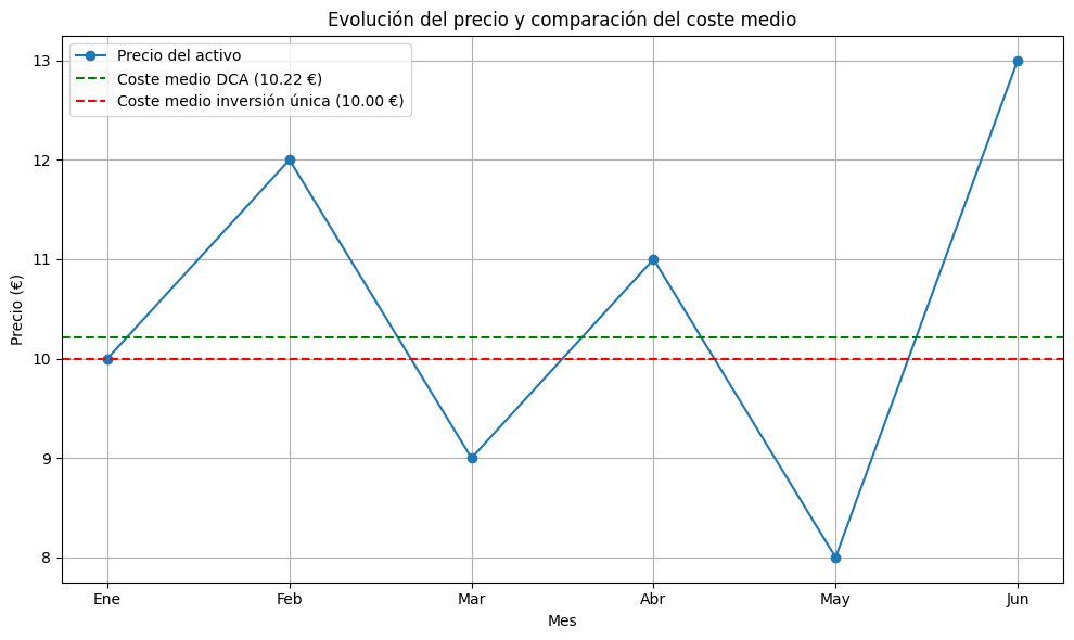 Si hubieras invertido todo de golpe cuando el precio estaba en, por ejemplo, 12 €, habrías conseguido solo 50 unidades. Con DCA has pagado menos por unidad y comprado más títulos con el mismo dinero.