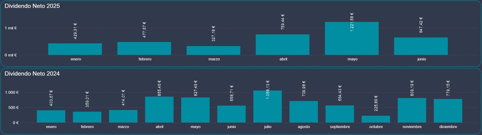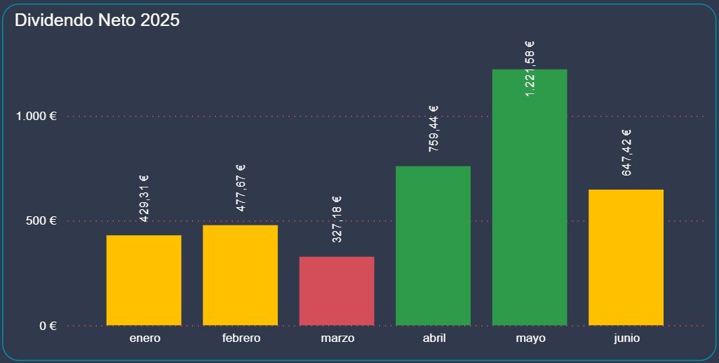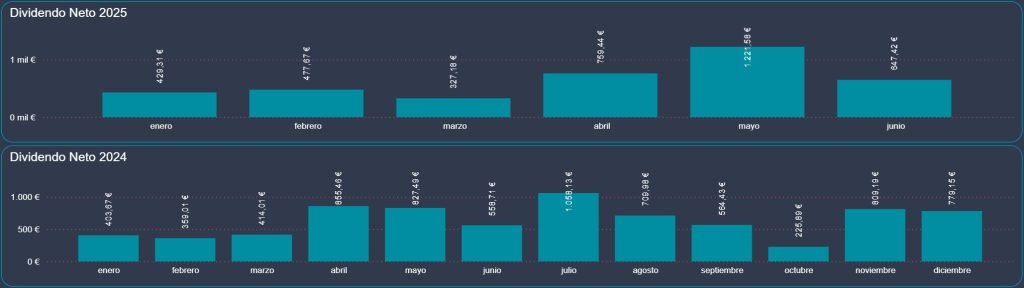 Junio ha cerrado con 647,42 € netos en dividendos, lo que supone una caída del 47% respecto a los 1.221,54 € de mayo. Este descenso es totalmente normal y responde al calendario de pagos, ya que mayo concentra los dividendos más importantes del año para varias compañías clave.