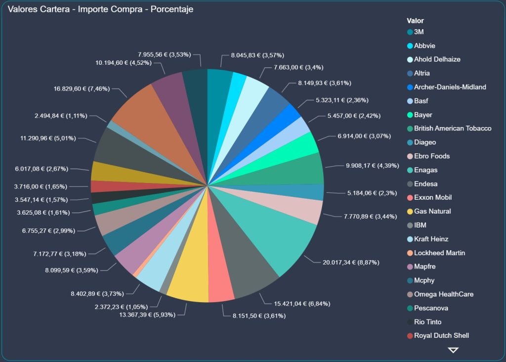 El análisis de esta tabla muestra que, a pesar de la ausencia de movimientos en junio, la cartera ha mantenido su valor y estructura, lo que evidencia una base sólida. La caída de ingresos por dividendos es estacional y no implica un deterioro del flujo total anual previsto.