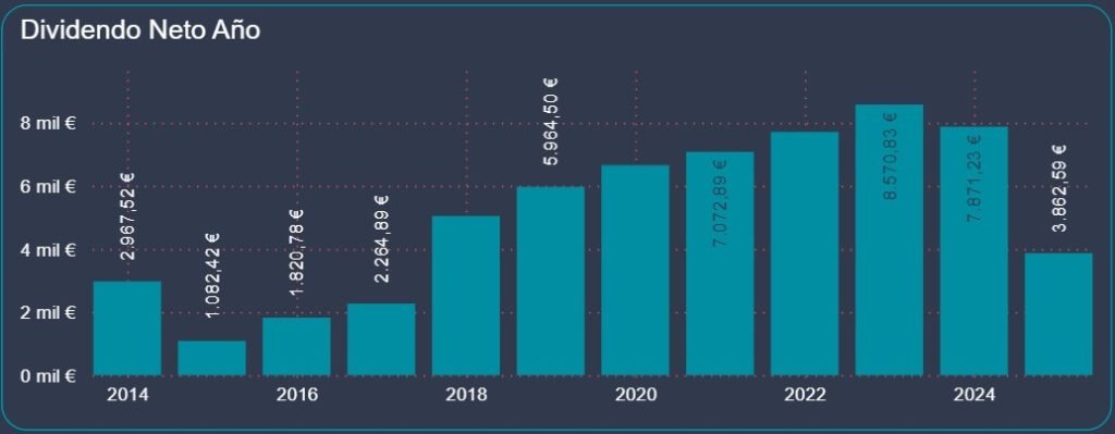 - Crecimiento sostenido: el incremento interanual de dividendos del 13,8% refuerza la idea de que la acumulación y reinversión funcionan.