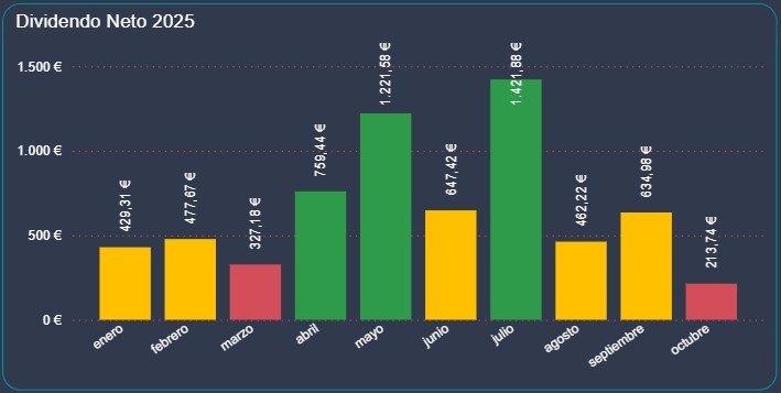 Octubre ha cerrado un mes tranquilo pero con matices. Tras un tercer trimestre especialmente sólido, este mes ha servido para consolidar los resultados, ajustar posiciones y prepararse para el tramo final del año. Aunque los dividendos han sido menores que en septiembre —algo previsible por el calendario de pagos—, la cartera sigue mostrando estabilidad, equilibrio y una evolución anual muy positiva.