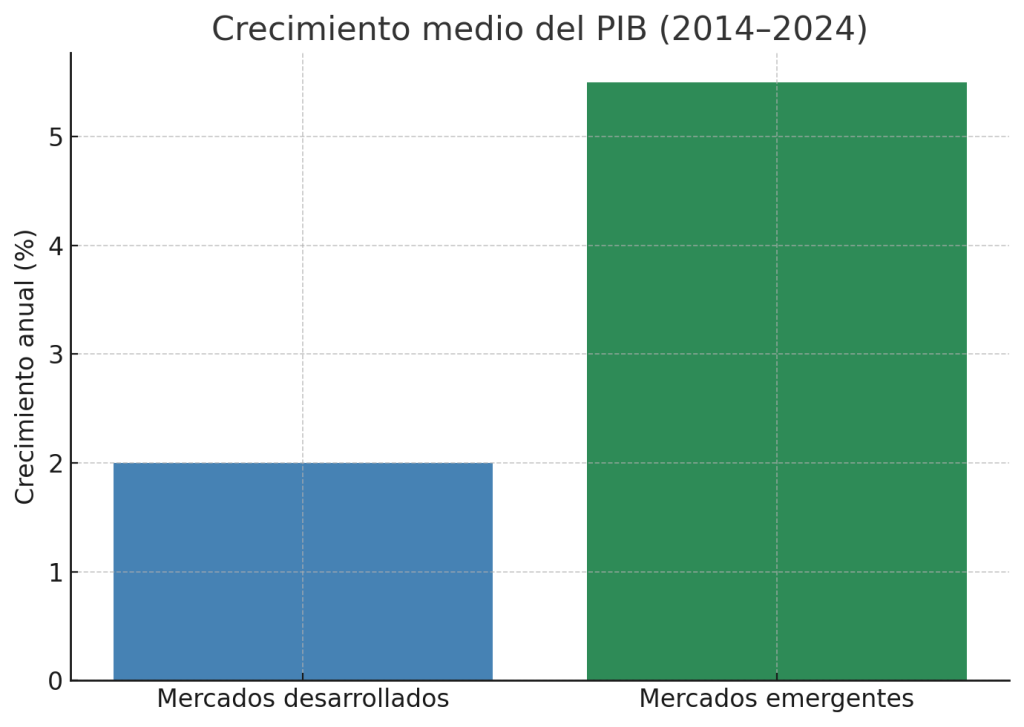 En términos de PIB, los emergentes llevan años creciendo al doble que las economías desarrolladas. Por ejemplo: