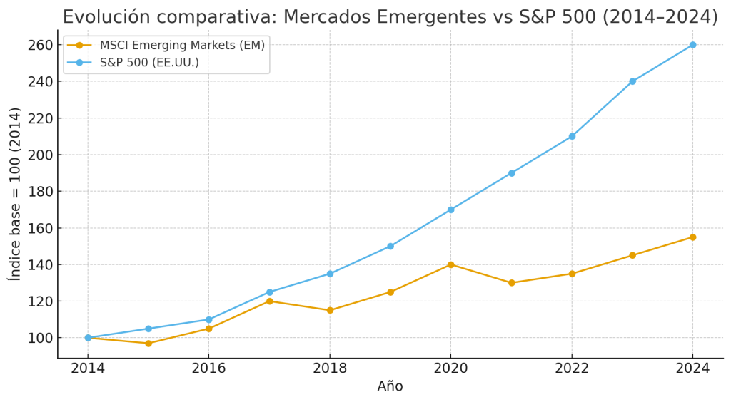 Como ves, los emergentes no siempre baten a EE.UU., pero en ciertos ciclos (por ejemplo, 2003–2007 o 2020–2021) han superado claramente a los desarrollados. Son un complemento, no un sustituto.
